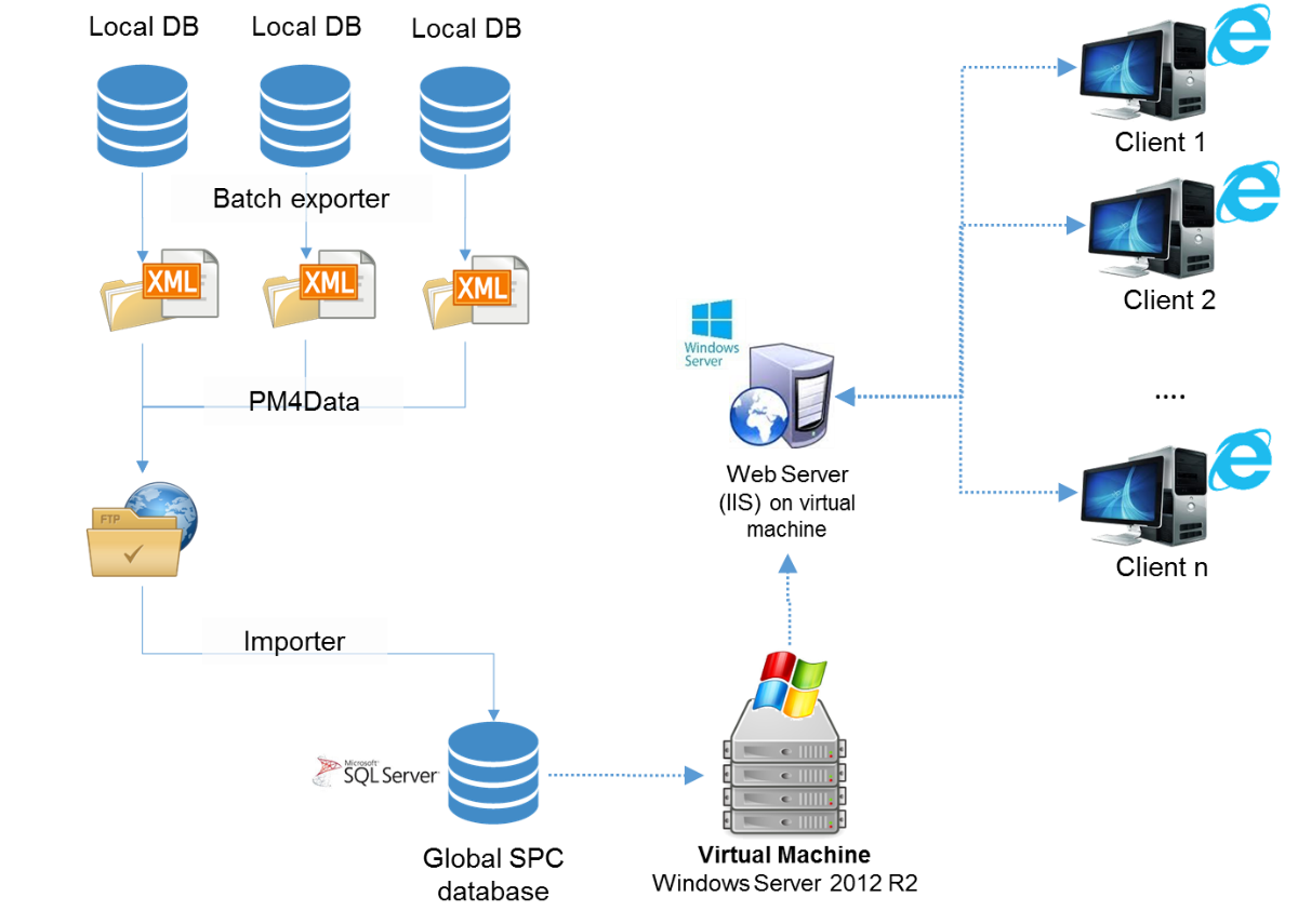 The system is made of a central repository where all the measures collected locally are store in the same database. The central repository is feeded daily by each local db trough xml files. As soon as the files are transferred by PM4Data into the destination folder, an importing procedure add the rows of each file into the central database. The local owners decide what to transfer to central repository, according to central quality department.