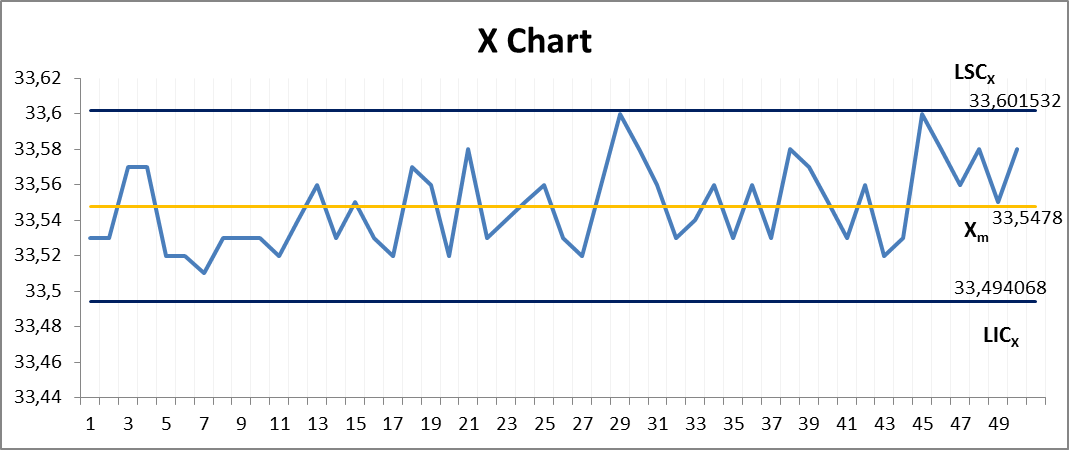 LSCX = UCLX = upper control limit for X Chart = Xm + A2 * R