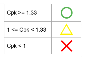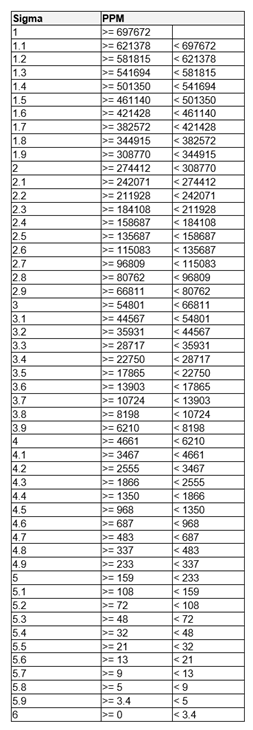 - TOTAL CAPABILITIES EVALUATION: process sigma level, Cp, Cpk, qualititative estimation of Cpk, total process deviations and average sample per day in the period). The sigma value of process is related to defects per milion opportunities (PPM actual) as follows: