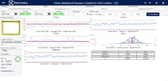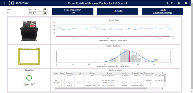 The Statistical Process Control is is a method for monitoring, controlling and improving a process through statistical analysis. The gauss chart, built using a set of values acquired over times for each dimension (sampling), represent the probability distribution of success results, compared to the project specifications (target value, lower limit, upper limit). Each value contained in the set is called survey. The central SPC is a web platform were all the sets of values of each critical measure (for each production plant) are collected, analyzed and shown in visual web user interfaces.